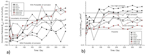 Figure 3 shows the variation of Ecorr and icorr, as a function of the immersion time in 3.5 wt %. NaCl solution. In Figure 3a that the elements repaired with conventional mortar MC with relation to w/c 0.78 have potential values less than −400 mV, indicating 90% probability of corrosion, the specimens with mortar MCX and MCXF do not present significant change because both have values of high probability of corrosion but at 200 days, show potentials close to −350 mV. It is important to highlight the values of the elements repaired with MECC-FA, MCCE-SF, and MMK/SCBA mortars since at 150 days, the steel rod starts to passivate and has values higher than −350 mV, and at approximately 300 days, has a 10% probability of corrosion. Otherwise, it happened with the elements repaired with mortar based on activated cement MMK that presented the values of Ecorr more electronegative.