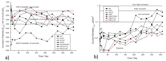 Figure 3b shows the current density values. The behavior of the repaired specimens with the mortars MCXF, MECC-FA, MCCE-SF, and MMK/SCBA, from 25 days to 365 days, have values between 0.1 and 0.5 μA/cm2, placing themselves in the ranges of low corrosion. In this respect, Andrade and González [57] describe that it is precisely in this range of values of icorr that the depassivation of the reinforcement is initiated. The other specimens presented very high values of current density in high and very high corrosion ranges. This is possibly due to the high alkali demand and the high specific surface area of MK, which leads to a high demand for water and, consequently, a high contraction and cracking [58] and in the presence of water, allows the entry of Cl− ions more easily.