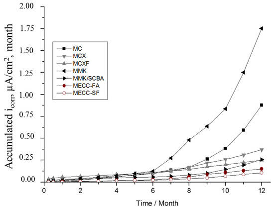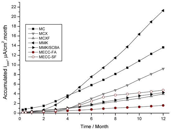 The discuss the icorr data is by using the accumulated corrosion graphs (μA/cm2 × month), which results from calculating the area under the icorr curve over time. This form of representation has the advantage that the accumulated corrosion, calculated by integrating the rate up to the appropriate age, always grows with time and allows a better comparison of the effects. This tool has been previously reported in this field [13,59,60,61,62]. The reported information discussed by these authors contains not only the use of cumulative corrosion, but also their interpretation in both natural and simulated tests.