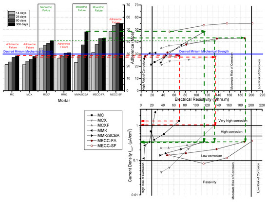 In the Figure 7, this diagram only presents mortars exposed in 3.5 wt % NaCl solution, this diagram relationship the adhesion tests of the mortars studied with the proposed concrete substrate, by using the slant shear method vs. electric resistivity vs. current density, obtained by the LPR method. It can be seen that the green lines correspond to the specimens repaired with MCXF, MMK/SCBA, and MEC-FA mortars, which showed an adequate adherence with the old concrete (substrate concrete) with a monolithic failure.