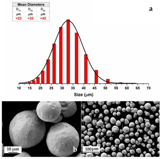 (a) Granulometry results with table and graphical interpretation; (b) detail of 316L stainless steel powders (FE-SEM) and (c) the same powders at low magnification (FE-SEM).
