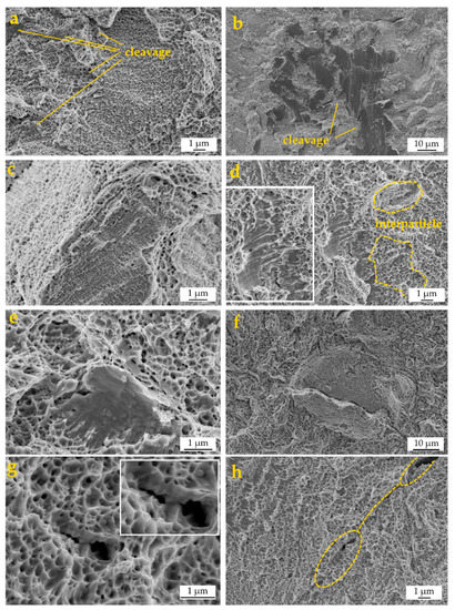 Example of principal features on the fracture surface of an LPBF 316L tensile specimen: (a) ductile fracture; (b) cleavage; (c) interparticle fracture; (d) cleavage cliff in the ductile region; (e) cleavage facet surrounded by ductile dimples, (f) microcrack growth obstructed by high toughness regions; (g) microcrack–microstructure interactions; (h) pore-nucleated microcrack.