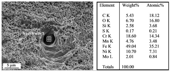 FE-SEM micrograph with an example of Cr-Mn-Fe inclusion, as demonstrated by EDS analysis.