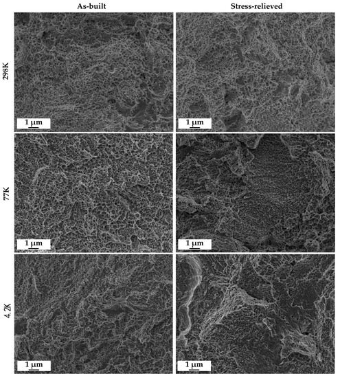 - The main factor impacting the mechanical properties of the tested samples was the testing temperature, while the stress-relieving treatment did not significantly affect the results both in terms of mechanical strength and ductility in comparison to the as-built condition. High tensile strength at cryogenic temperatures was characteristic for all samples, with UTS reaching its maximum value of 1246 MPa at 4.2 K. At ambient temperature, the UTS was about 560 MPa for both as-built and stress relieved conditions.
