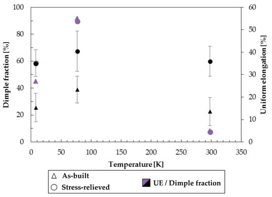 Results from quantitative image analysis: dimple average fraction across the fracture surface as a function of temperature for the 316L samples by LPBF tested in the as-built and stress-relieved conditions.