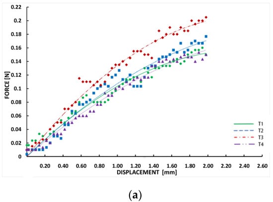 The experimental and simulation flexibility results for the four BDS models with different struts are shown in Figure 5. The relationship between the displacement and the force corresponding to the four different stent designs during the bending process is presented. The force in the simulation was defined as the downward pressure from the indenter on the stent in the experiment. Displacement represents the displacement of the loading position of the stent in the direction of the load.