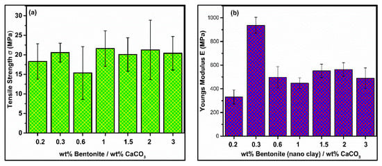 The effective synergistic role of bentonite and CaCO3 tells us that not always surface treatment, but a careful selection of particles can also effectively transfer the externally applied load between the polymer and the filler even without the application of compatibilizer. The homogeneous distribution of the components, as shown earlier in Figure 2, is the manifestation for this assertion (we also prefer recalling Section 3.5.1 for further explanation) [13,14,27]. Thus, it can be summarized, that for higher values of Equation (1) (high bentonite vs. CaCO3), improved TS can be obtained by combination of (a) the compatibilization effect, (b) the knifing effect and (c) the encapsulation of CaCO3 filler particles by bentonite.