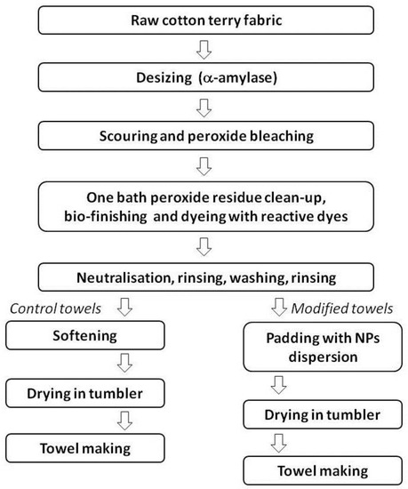 All finishing processes (pre-treatment, bleaching, dyeing, softening, modification) were carried out in ZWOLTEX Sp. z o.o., Zduńska Wola, Poland. A schematic representation of the finishing process is presented in Figure 1. The modification process with ZnO NPs and N-dopped TiO2 NPs of terry woven fabric is protected by Polish patent application No P.433366.