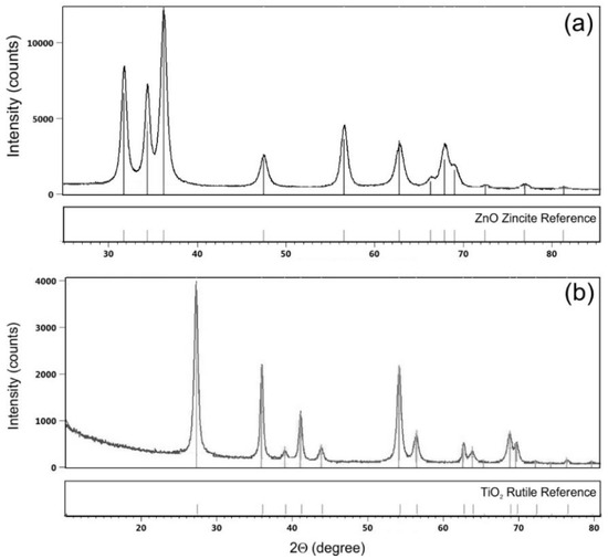 The results of XRD measurements of ZnO and TiO2 commercial dispersions of NPs are shown in Figure 2. The XRD pattern of ZnO NPs (Figure 2a) shows diffraction peaks at 2Θ = ca. 31°, 34°, 36°, 47°, 56°, 62°, 66°, 67°, 69°, 72°, 77° and 81°, which are characteristic for hexagonal zincite ZnO [43]. The XRD pattern of TiO2 NPs (Figure 2b) shows diffraction peaks at 2Θ = ca. 27°, 36°, 39°, 41°, 44°, 54°, 56°, 63°, 64° and 69°. The XRD pattern are characteristic for tetragonal rutile TiO2 [44,45].