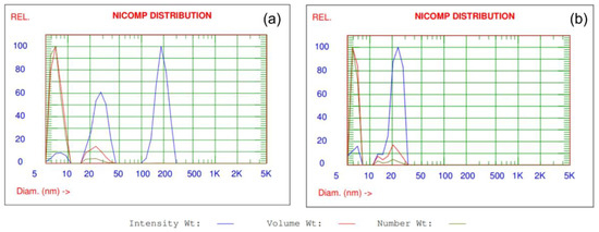 The Nicomp distributions of the intensity-, volume- and number-weighted data collected for ZnO and TiO2 NPs in dispersions are shown in Figure 3. The assumptions of DLS Nicomp analysis were described in details by [41]. DLS analysis of particles size and size distribution confirms that ZnO and TiO2 are in dispersions in the form of nanoparticles. The size of ZnO NPs and TiO2 NPs in dispersions are in the range of 7.1–23.8 nm and 6.3–21.4 nm, respectively. The biggest percentage fine fraction of particles, both for ZnO and TiO2 NPs are observed in dispersions in the range of 85.4–87.2% for volume weight intensity and 95.3–96% for number weight intensity.
