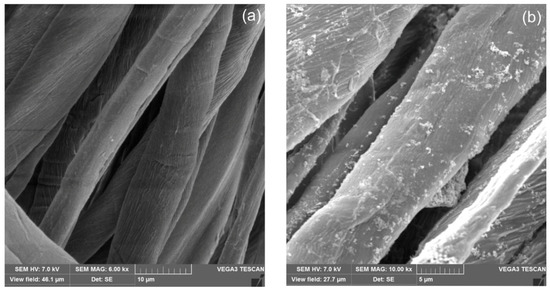 The morphology of ZnO and TiO2 modified cotton terry towels was examined with the scanning electron microscopy (SEM) technique. Figure 4 shows SEM images of unmodified and modified cotton terry towels with magnification of ×6000 and ×10,000, respectively. It can be seen the nanoparticles homogeneously (Figure 4b) dispersed on the fibers surface. Unfortunately, a magnification of SEM microscope did not allow to clearly shown the nanoparticles as were stated by the DLS analysis.