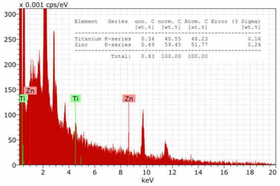 The EDX studies (Figure 5) confirmed the presence both Zn and Ti elements on the surface of modified cotton terry towels.