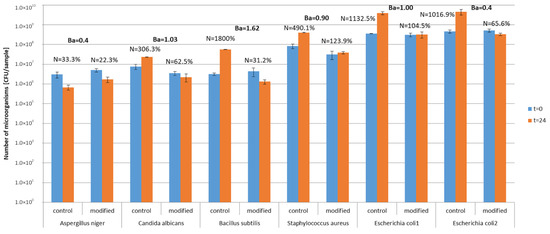 Study in model conditions showed that microorganisms survived on textiles in both control and modified materials (Figure 6). Survival indexes on control textiles ranged from N = 33.3% (A. niger) to N = 1800% (B. subtilis), which indicates that the number of microorganisms increased after 24 h incubation on textile materials. On photocatalytically modified textile materials, the survival index was N = 22.3–123.9% and the number of microorganisms decreased by one logarithmic scale after 24 h of incubation. Biostatic activity of photocatalytically modified textiles against the tested microorganisms in model conditions was on the low and medium level A = 0.4–1.62. The lowest activity of modified materials was determined for mold A. niger and the highest for bacteria B. subilis. Comparing two samples of the modified textile materials with E. coli under different lighting conditions (without light and under natural light), it was found that the biostatic activity of the material against this bacterium increased from A = 0.9 in conditions without light to A = 1 in natural light conditions after 24 h of incubation.
