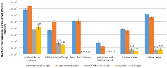 The highest reduction of the number of microorganisms on modified towels was determined for bacteria. The number of Enterobacteriaceae, Enterococcus, the coli group and E. coli, and Pseudomonas decreased to 0–5 CFU/cm2. A low number of fungi on the modified towels was also noted (2.7 × 101–5.3 × 101 CFU/cm2), while the number of bacteria was on the level of 5.7 × 103–1.5 × 104 CFU/cm2.