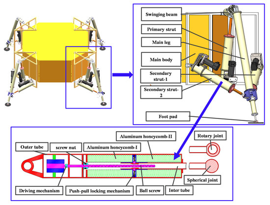 This paper designs a novel movable lunar landing mechanism. The mechanism consists of four identical landing legs evenly mounted around the body of the ML. The landing leg is composed of a primary strut, two secondary struts, a swinging beam, a main leg, and a foot pad. The primary strut and secondary strut adopt the same structure including outer tube, inner tubes, driving mechanism and buffer materials, as shown in Figure 1.