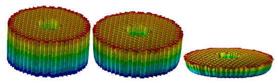 In order to obtain more accurate compression rate parameters of three aluminium honeycomb materials (HB1, HB2, and HB3) under static pressure. According to the geometric parameters of HB1, HB2, and HB3 in Table 1, their shell model was established by using commercial software Workbench. The material density was set to 2730, 2730, and 2680 kg/m3, respectively. The tensile strength was set to 150, 150, and 200 MPa, respectively. The yield strength was set to 115, 115, and 65 MPa, respectively. In order to capture the mechanical properties of the honeycomb under large plastic deformation, the type of elements for the three honeycomb materials is modelled with tetrahedral mesh elements with 4 nodes. The element size is set to 0.02 mm. The number of finite elements was 1,519,496, 2,269,506 and 2,198,152, respectively. The reference point method is used to determine the boundary conditions of honeycomb materials. In order to avoid the honeycomb structure buckling during the compression process. A fixed constraint was applied to the bottom of the element model and a constant pressure of 50 KN was applied to the upper surface, and the simulation time is set to 1500 s. Simulation results of static pressure are shown in Figure 4 and Table 1.