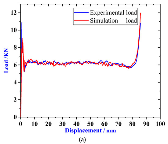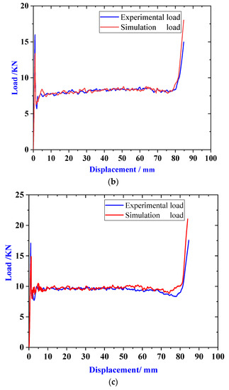 Under the condition of static pressure load, simulation experiment and static pressure test were carried out on the buffer material, and the load-displacement curves of HB1, HB2, and HB3 were obtained, as shown in Figure 7a–c. It can be observed that simulation results agree with the experimental results well. The difference between the experimental and numerical curves may be caused by the rupture of the material in the experimental test while the numerical models did not take into account the failure of material. Through experiments we have obtained the average load of HB1, HB2, and HB3 are 6.25, 8.27, and 9.55 KN, respectively.
