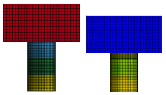 In this paper, ANSYS software is used as the pre-processing software for finite element analysis, and LS-DYNA software solves the impact of AH materials. In order to improve the computing speed, the grid cell size of HB1, HB2, and HB3 were set to 0.5 mm. Honeycomb of Nonlinear-Foam Material Models is used as a material model in HB1, HB2, and HB3. Material parameters are shown in Table 1. Density: set to 30, 36, and 50 kg/m3, respectively. Initial yield strength: set to 130, 135, and 135 MPa, respectively. Elasticity modulus: set to 40.39, 41.02, and 41.73 GPa, respectively. Poisson’s ratio: Set both to 0.33 Viscous damping coefficient set both to 0.2. The type of elements was selected for hexahedral mesh-Hex/Wedge. As shown in Figure 9. The buffer material model was placed between the rigid mass block and the fixed surface, and the bottom HB3 material was fixed. The reference point method [48] is adopted to determine the boundary conditions and initial velocity of the impact mass block. All degrees of freedom are limited except for translation along the direction of collision. When three material models in series are impacted by a mass block, in order to prevent contact between each surface of the model from penetrating, the contact type was selected to be single-side automatic contact. In order to ensure that the simulation results of metal honeycomb impact are close to the real results, the dynamic friction coefficient between the mass block and the aluminum honeycomb material is set to 0.2.