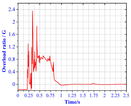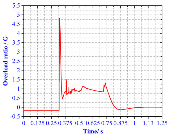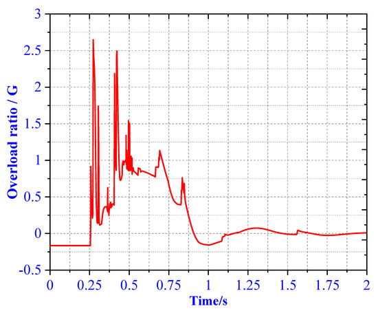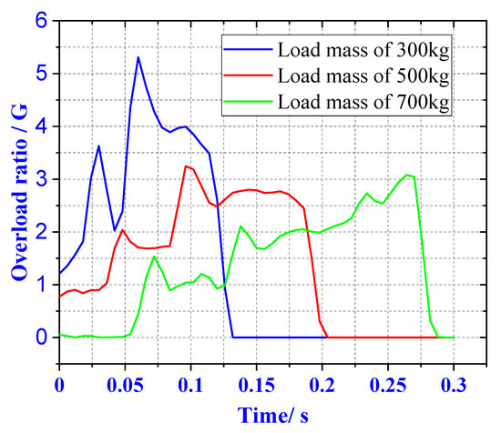 It can be seen from Figure 10, when the load mass is 300 kg, the overload rate is 5.2 G. With the increase of the load mass to 500 and 700 kg, the total length of the buffer material is 450 and 600 mm, respectively. The overload rate was reduced to 3.2 and 3 G.