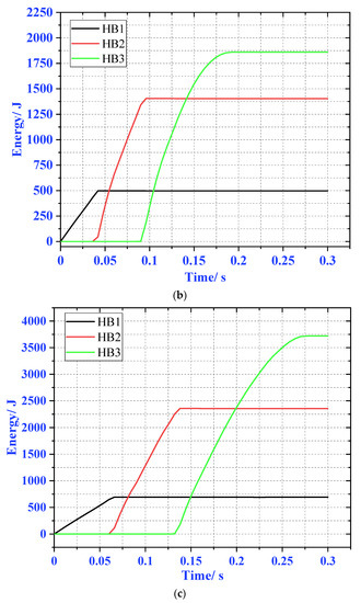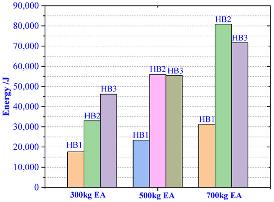 In Figure 11, when the load mass is 300 kg, the three materials are completely compressed. With the increase in the density of HB1, HB2, and HB3, the EA of HB1, HB2, and HB3 increase continuously. When the load mass is 500 kg, the total length of the three buffer materials increased in equal proportion, HB1 and HB2 are all compressed. The HB3 material was not completely compressed, resulting in the energy absorbed by HB2 and HB3 being similar. When the load mass was 700 kg, HB1 and HB2 were all compressed. HB3 absorbed less energy than HB2 because of the reduced ratio of length to which HB3 was compressed.