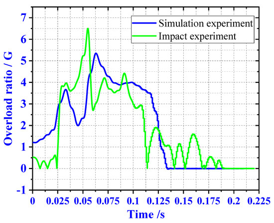 In order to verify the feasibility of the proposed material combination, an experimental verification was carried out on a 300 kg load and 300 mm buffer material. We selected the CL-100 impact experiment bench to complete the impact experiment. It can be seen from Figure 13 that the material did not collapse locally after the impact. In Figure 14, the maximum overload rate of the simulation experiment is 5.3 G, and the maximum overload of the impact experiment is 6.4 G. The overload rate of the simulation is lower than that of the actual impact experiment, but it has the same trend. The matching method of the buffer experiment meets the requirements of buffer EA. We calculated the theoretical and simulated values of the MSEA and VSEA of the buffer material, as shown in Table 4.