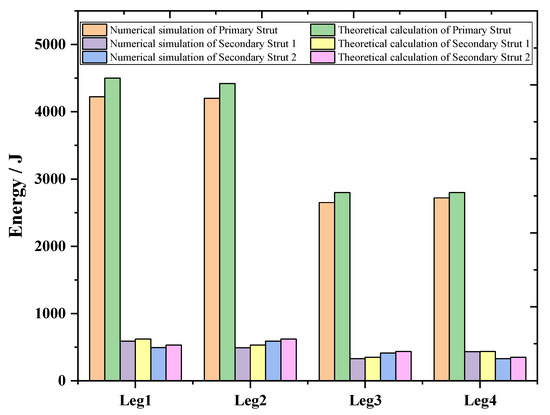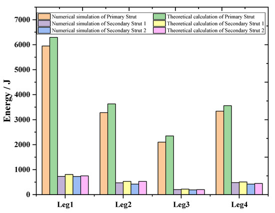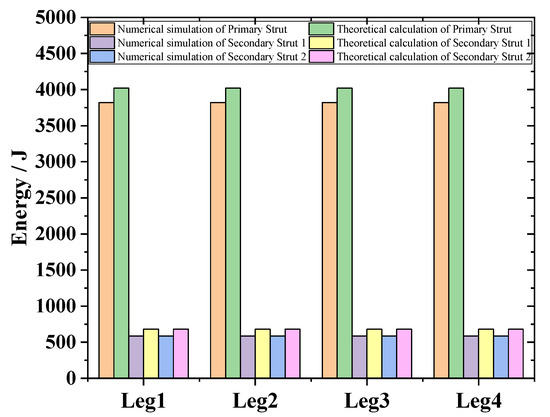 Case 2 is a 2-2 type landing, Leg1 and Leg2 first landed at the same time, then Leg3 and Leg4 landed at the same time. As can be seen from Figure 19, the main body’s buffer time is between 0.25–1.65 s, and the overload rate appears two similar peaks are 2.61 and 2.43 G, respectively. The overload factor meets the design requirements. At the same time, in order to verify whether the buffer structure is reliable, the theoretical and simulated EA of the AH material inside the primary strut and secondary struts are compared and analyzed. In Figure 20, we found that the theoretical EA of the primary struts of Leg1 and Leg2 is 4500 J, the theoretical EA of Leg3 and Leg4 primary struts is 2800 J, and the theoretical EA of secondary struts 1 and secondary struts 2 of Leg1 and Leg2 is 630 J. The theoretical EA of the secondary struts 1 and 2 of Leg3 and Leg4 is 500 J.