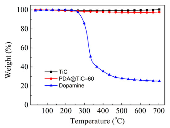 Figure 5 depicts the results of the TG analysis of TiC particles, PDA@TiC−60 and dopamine, respectively. TiC is a transitional metal carbide with similar properties to metals that have a high melting point and high hardness so its weight was not affected by temperature, while, dopamine is an organic substance that decomposed readily at high temperatures. Dopamine’s weight began to decline dramatically at 250 °C, which is consistent with the loss of features of PDA as reported in [1]. Compared to TiC, PDA@TiC−60 particles also began to lose a small amount of weight at 250 °C. This result further confirms the surface modification TiC with PDA, and corresponded to the results obtained using TEM. The weight loss of PDA@TiC−60 can be measured at approximately 2.8% of its total original weight.
