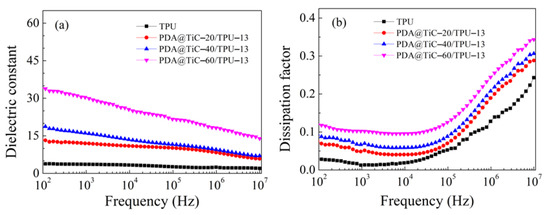 The dependence of the dielectric properties of TiC/TPU and PDA@TiC−60/TPU composites are shown in Figure 6 The dielectric constant of pure TPU kept at a low value and shows a weak frequency-dependent behavior. Compared to pure TPU (ε = 3.6 at 103 Hz), the dielectric constants of TPU composites with pristine and surface modified TiC were notably increased, and approached to a monotonous increase with the doping content of the fillers in Figure 6a–c. There may be three reasons contributed to this result. Strong interfacial polarization effects would occur at low frequencies according to the Maxwell–Wagner effect; when exist (where and are dielectric constants of TPU and TiC, and are conductivities of TPU and TiC), the effect of interfacial polarization appears in the interface between the PDA shell and the TiC core [26,27,28,29], and the time for the polarization is abundant. The inorganic particles may disrupt the phase separation of TPU, resulting in the disruption of the hydrogen bonding between TPU chains and thus increasing the dipole polarization of the TPU chains under low frequencies [30,31]. Finally, the introduction of TiC provides additional free charges. The dielectric constant gradually decreases with increasing frequencies due to polarization failing to keep pace with the changes of the applied electric field, and a strong dielectric relaxation appears [32], where the composites finally exhibit characteristics related to insulation.