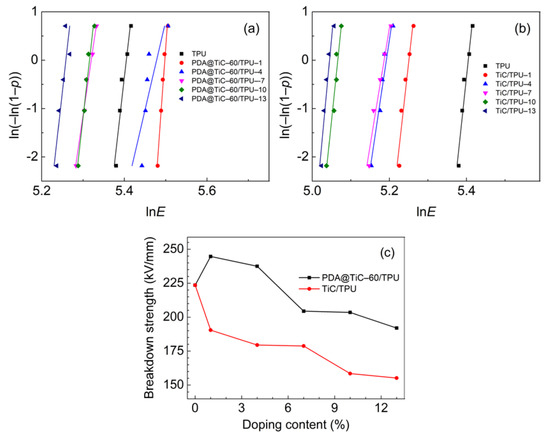 Weibull plots of PDA@TiC−60/TPU (a) and TiC/TPU (b) and the breakdown strength of PDA@TiC−60/TPU and TiC/TPU with different weight loadings of fillers (c).