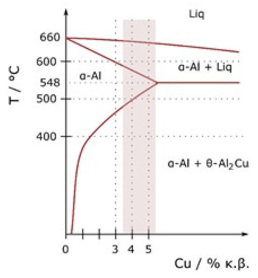 - Available online: https://commons.wikimedia.org/wiki/File:Al-Cu-phase-diagram-partial-greek.svg (accessed on 27 July 2020).