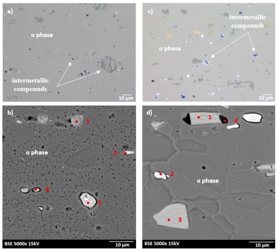 Microstructure of the AW-2024-T3 alloy after DCS measurements: (a) microstructure of bare AW-2024-T3 obtained by LM; (b) microstructure of bare AW-2024-T3 obtained by SEM; (c) microstructure of clad AW-2024-T3 obtained by LM; (d) microstructure of clad AW-2024-T3 obtained by SEM.