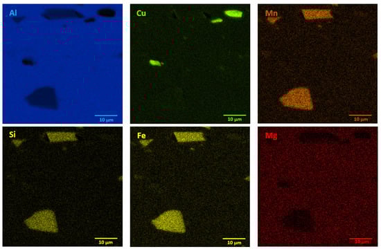 The microstructures of as-received bare and clad AW-2024-T3 alloys are shown in Figure 2a–d. In micrographs obtained by a digital microscope, the multi-phase microstructure composed of α-Al matrix with a range of precipitations dispersed over the microstructure of the Al alloy was made visible (see Figure 2a,b). The α phase corresponds to the solid solution of Cu and the rest of the additives in the face centered cubic (FCC) lattice of Al. The observed precipitations indicate the Al-Cu-X intermetallic compounds [22,23,24,25,26,27]. The microstructure of bare AW-2024-T3 consists of equiaxed grains of the α phase with a size of around 50 µm (Table 2, Figure 2a,b), whereas clad AW-2024-T3 grains exhibit elongation with a large variation around the average values (Figure 2c,d). It was also revealed that the elongation ratio defined as the length/width is higher than 2 (Table 2). Elongated grains are the result of the rolling of the plate over cladding. Typical coarse intermetallic phases for both bare and clad AW-2024-T3, detected by backscattered electron mode with SEM and quantified by EDS, are also shown in Figure 2b,d. In the EDS (Figure 3 and Figure 4, Table 3) analysis, the intermetallic precipitations observed for both AW-2024-T3 bare and clad alloys are various particles with high concentrations of Al, Cu, Mn, and Fe, and they are also enriched by Si.