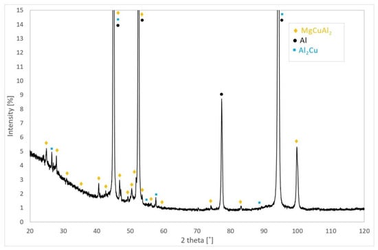 The presence of the precipitates such as MgCuAl2 and Al2Cu in the bare AW-2024-T3 alloy in the initial state was confirmed through X-ray diffraction (XRD) patterns (see Figure 5). The peaks originating from the α-Al phase, of which the matrix is composed, were also detected on the XRD patterns.