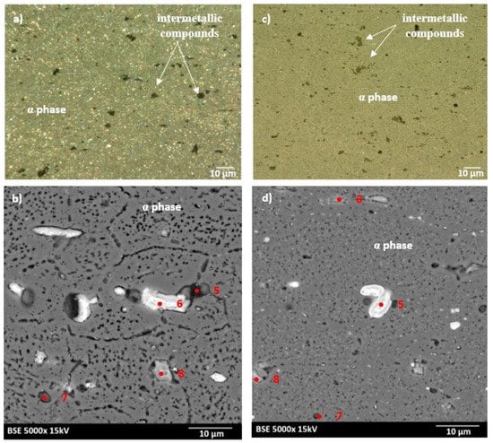 The microstructures of as-heated bare and clad AW-2024-T3 alloys (after DSC measurements) are shown in Figure 6a–d. As can be seen in Figure 6, changes in the microstructure of both states of the AW-2024-T3 alloy took place during exposure to elevated temperatures during DSC measurements which indicates that some reactions occurred. Heating during DSC measurement resulted in more precipitation throughout the Al matrix for bare and clad AW-2024-T3 alloys. Bare AW-2024-T3 alloy with irregularly shaped particles denoted as 5, 6, and 8 in Figure 6b possess high contents of Al and Cu with a small addition of other alloying elements, while particles denoted as 7 in Figure 6b are rich in Si. Clad AW-2024-T3 alloy precipitate denoted as 5 in Figure 6d contain high amount of Cu, whereas precipitate denote as 7 contain a lot of Si. Both precipitates (5 and 7 in Figure 6d) exhibit a low amount of Al. Precipitates denoted as 6 and 8 in Figure 6d are composed mostly of Al with the addition of the rest of the elements. It should be noted that the high concentration of Al may be because these precipitates are quite small and signals collected during EDS analysis may come from the matrix. For bare AW-2024 alloy, dispersoids were also found to be in much greater concentrations in the alloy after DSC testing. This, in turn, means that there are higher exothermic reaction peaks after DSC measurement. Nevertheless, the endothermic (dissolution) and exothermic (precipitation) reactions were shown to be incomplete solid solutions, which demonstrates the occurrence of partial solid solutions. It is worth noting that microstructures of both bare and clad AW-2024-T3 alloys exhibit clear visible features that are characteristic of over-aging. Looking at the microstructures in both LM and SEM images, the post-DCS measurement conditions presented coarser precipitation at the grain boundaries compared with the initial state. Furthermore, precipitates inside grains were even coarser, indicating that over-aging had taken place. According to the EDS analysis (Table 3), newly grown precipitates were enriched mostly in Fe but also in Cu, Mg Mn, and Si. Furthermore, partial recrystallization occurred during DSC measurement for the clad AW-2020-T3 alloy.