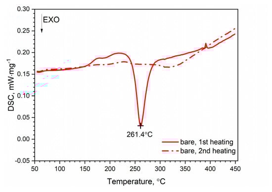 Viscoelastic, i.e., dynamic moduli (storage E′ and loss E″) tests were performed in the range of 50–400 °C using a DMA 242C dynamic mechanical analyzer (NETZSCH-Gerätebau GmbH, Selb, Germany). The 3-point bending mechanical mode with a frequency f of 1 Hz and a HR of 2 °C⋅min−1 was used. DMA can be simply described as applying an oscillating force to a sample and analyzing the material’s response to that force [16]. Then, the ability of the material to return or store energy (E′), its ability to lose energy (E″), and the ratio of these effects (tan δ), which is called damping factor, could be explored. The measurements were performed in an air environment.