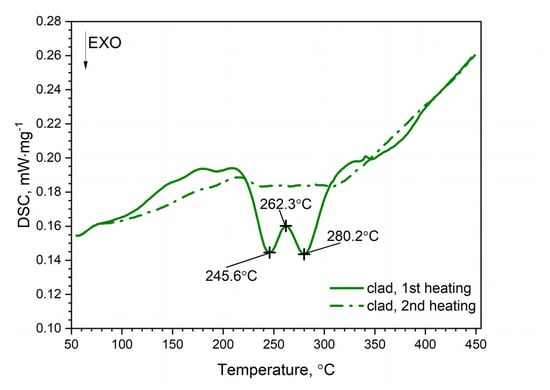 Results of the Vickers hardness/microhardness tests are presented in Table 2. It can clearly be seen that after DCS testing, the hardness of analyzed Al alloys notably decreased from 118 HV and 125 HV in the initial state to 70 HV and 59 HV for the bare and clad states, respectively. The decrease in hardness was caused by changes that occurred during heating in DSC testing. The softening of the analyzed Al-alloy appeared as a result of dissolution of the hardening GPB zones as well as some of undissolved Al2Cu and Al2CuMg intermetallic phases into solid solution [32].