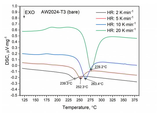 DSC thermograms of bare AW-2024-T3 at various heating rates (HRs).