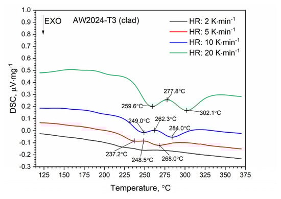 DSC thermograms for the first and second heating runs for the AW-2024-T3 and clad AW-2024-T3 alloys are shown in Figure 7 and Figure 8. The second run did not identify exothermic or endothermic heat transitions. The nature of these heating runs is typical for isotropic solids. The combination of the first and second passes allowed the identification of the temperature ranges of the first run in which dissolution and precipitation processes occur. So, for the AW-2024-T3 alloy (Figure 7) in the temperature range of 150–245 °C, in the endothermic process, the dissolution of GP and GPB zones occurred. In the temperature range from 245 to 285 °C, there was θ′ and S′ phase precipitation. Above 285 °C, dissolution of phase precipitations occurred. At the end, a stable equilibrium of the θ-Al2Cu and S-Al2CuMg phases formed. A small peak at around 390 °C at HR = 10 °C⋅min−1 is visible in Figure 7, but was not confirmed by any other DSC signals obtained with a different HR (Figure 9).