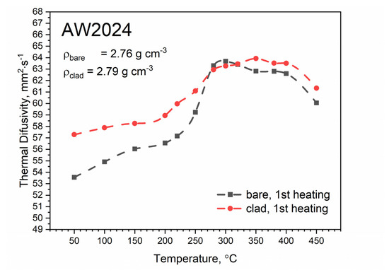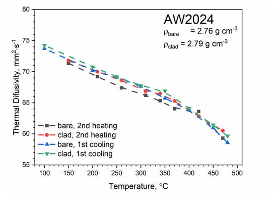 Temperature tests of thermal diffusivity were carried out during both heating and cooling of the measuring sample. The temperature characteristics of thermal diffusivity for bare and clad AW-2024-T3 alloys obtained from the first heating runs are shown in Figure 11. In the temperature range from about 270 °C, both characteristics were virtually the same. In the temperature range of up to about 300 °C, thermal diffusivity increased as a function of temperature. In the range of 300–400 °C, changes in thermal diffusivity were small, and then a decrease of about 6% in relation to the maximum value was observed.