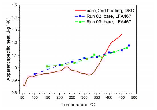 - Specific heat determined from LFA investigations (second and subsequent heating) using the comparative method and from DSC studies:An increase in the specific heat value was observed within the temperature range of 100–480 °C, and this was comparable for both alloys. Slight discrepancies between DSC and LFA specific heat results that did not exceed 10% were observed;