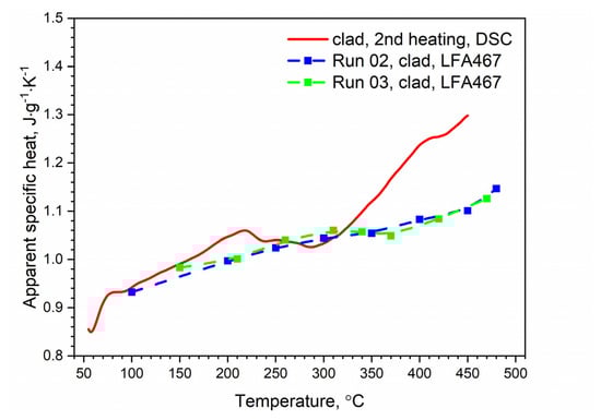Comparison of the specific heat of the clad AW-2024-T3 alloy obtained from DSC (second heating run) and LFA measurements.