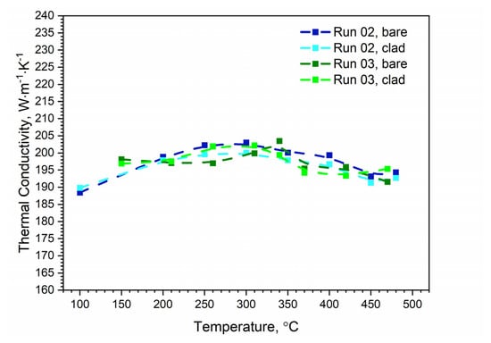 - At 50–300 °C (bare and clad), there is a monotonic increase in thermal diffusivity from 53 mm2⋅s−1 (bare) and 57 mm2⋅s−1 (clad) up to 64 mm2⋅s−1 (for both alloys);