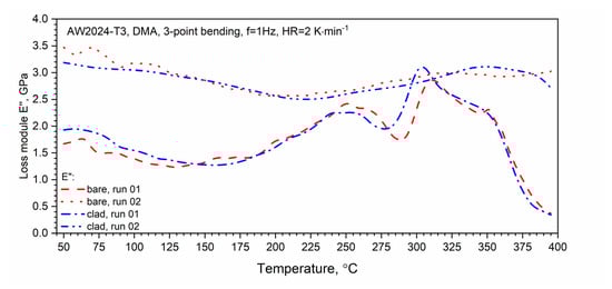 Dynamic loss modulus E″ of bare and clad AW-2024-T3 (first and second runs).