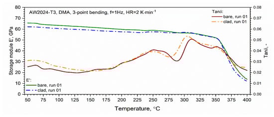 Dynamic storage modulus E′ and tan δ (dynamic dumper factor) of bare and clad AW-2024-T3 (first heating).