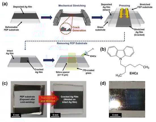 (a) Schematic illustration of the preparation of cracked Ag electrode in a controlled manner, and the fabrication of device. (b) Chemical structure of (9-2-ethylhexyl)carbazole (EHCz). (c) Photographic images of the cracked Ag film after completing the cold-welding process. (d) Photographic image of the cracked Ag film inducing diffuse reflection.