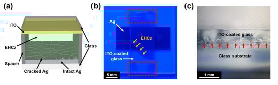 Each prepared Ag electrode was covered with another glass substrate coated with indium-tin oxide (ITO) (20 Ω sq−1), and silica microsphere spacers (of 5-μm diameter) were used for a fixed gap distance between Ag and ITO. The gap between the two electrodes was then filled with EHCz by capillary action to complete the device structure (see Figure 2). The active area of each device was 1 × 1 cm2. It is worth noting that EHCz is highly viscous, which substantially hinders the infiltration into smaller gaps (in the submicron range). Even if EHCz well stays in the gap without leakage due to its high viscosity, the two substrates (i.e., lower and cover glasses) should be securely fixed to prevent slipping by the liquid.