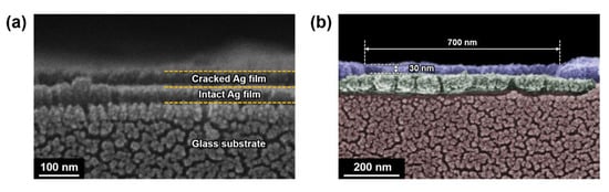 Figure 4 also shows cross-sectional SEM images of the BA140 sample. For these SEM measurements, platinum (Pt) was coated onto the sample with a thickness of ~5 nm to clearly observe the non-conductive glass substrate. It was confirmed that the cracked Ag film was neatly transferred and welded on the intact Ag film through the cold-welding process. It is worth noting here that metal oxide layers could not be easily transferred and welded onto other substrates in our experimental setup, and thus binding materials would be required to enhance adhesion.