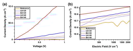 (a) Current density-voltage (J-V) characteristics of the devices using the reference, UA120, UA140, BA120, and BA140 electrodes, in a linear scale. The characteristics were measured in low bias region (i.e., ohmic current region). All the characteristics showed a linear relationship, and that the slope ratio of the device with the BA140 electrode to the reference devices was ~170. (b) Electric field dependence of the current density. All the slopes were measured to be ~1, indicating ohmic current in each device.