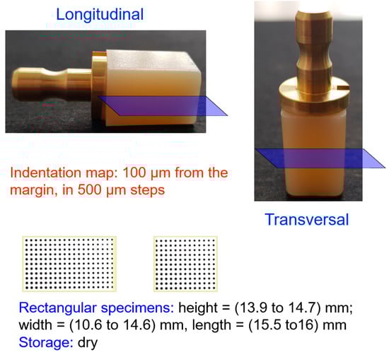 A series of micro-mechanical parameters were calculated from depth-sensing indentations (automatic micro-hardness indenter, Fischerscope H100C, Fischer, Germany) according to DIN 50359-1:1997-10 []. Measurements were made in CAD/CAM sections in 500 µm steps to create an area mapping comprising 600 to 900 indentations per each specimen, given by the individual specimen geometry. In tooth specimens, 20 randomly chosen indentations per specimen were performed in both enamel and dentin.