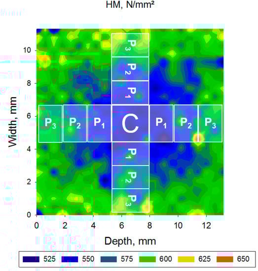 Allocation of the central (C) and peripheral (P) zones in a data map using the example of the variation of the parameter Martens hardness (HM) in the material SB.